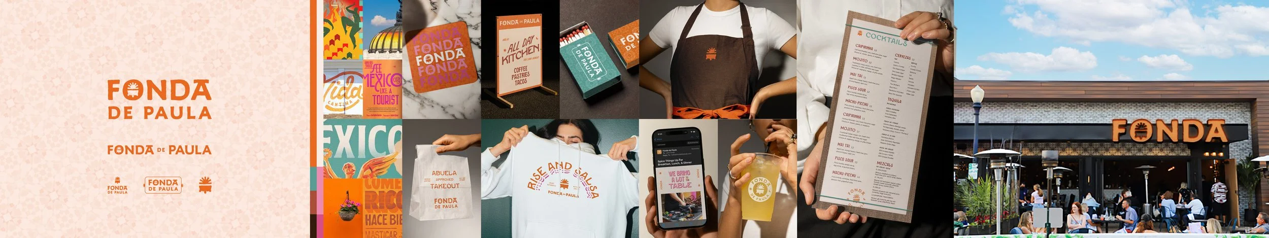 Like the restaurant itself, the visual identity caters to a variety of needs. One of the specialties of Fonda de Paula is the handmade guacamole, prepared right at the table. We carried this idea into the brand’s logo suite, featuring a traditional Mexican molcajete with a sun that symbolized the all-day nature of the restaurant’s offerings.